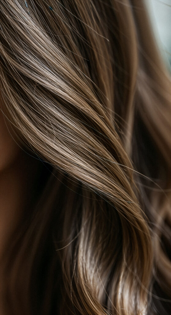Le schiariture incorniciano il viso con riflessi morbidi e armoniosi, mentre gloss e sfumature completano il risultato donando luminosità, profondità e movimento.